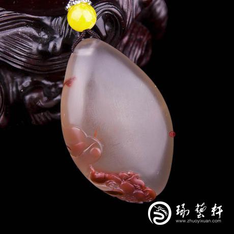 玉质:南红玛瑙冰飘吊坠,正面纯净,无裂,点缀以纯正南红斑点做巧色荷花,天然南红飘花原生态小鱼形状,精巧可爱,荷花雕工细腻流畅自然和小鱼呼应,独具匠心。