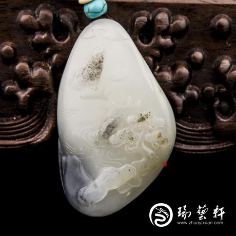 新疆和田籽玉,黄皮青花籽玉,独子。玉质温润无暇,质地细腻,油润度佳。此独子形制规整,画中的茅舍清丽脱俗,山石奇险峻峭,远处的留白意境清幽,山水之间令人遐想连篇,布局疏密得当,简约唯美的设计、素雅端正的风格,明丽清晰的雕刻,再加上细润通透的质地和光滑舒适的手感,令人一见之下,再难片离。