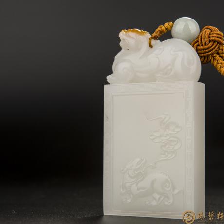 黄沁籽料,色羊脂白,强光下几乎不见结构,油度佳。整件上方立体雕刻神兽,正面浅浮雕神兽,可做印章。可提供免费刻字服务。